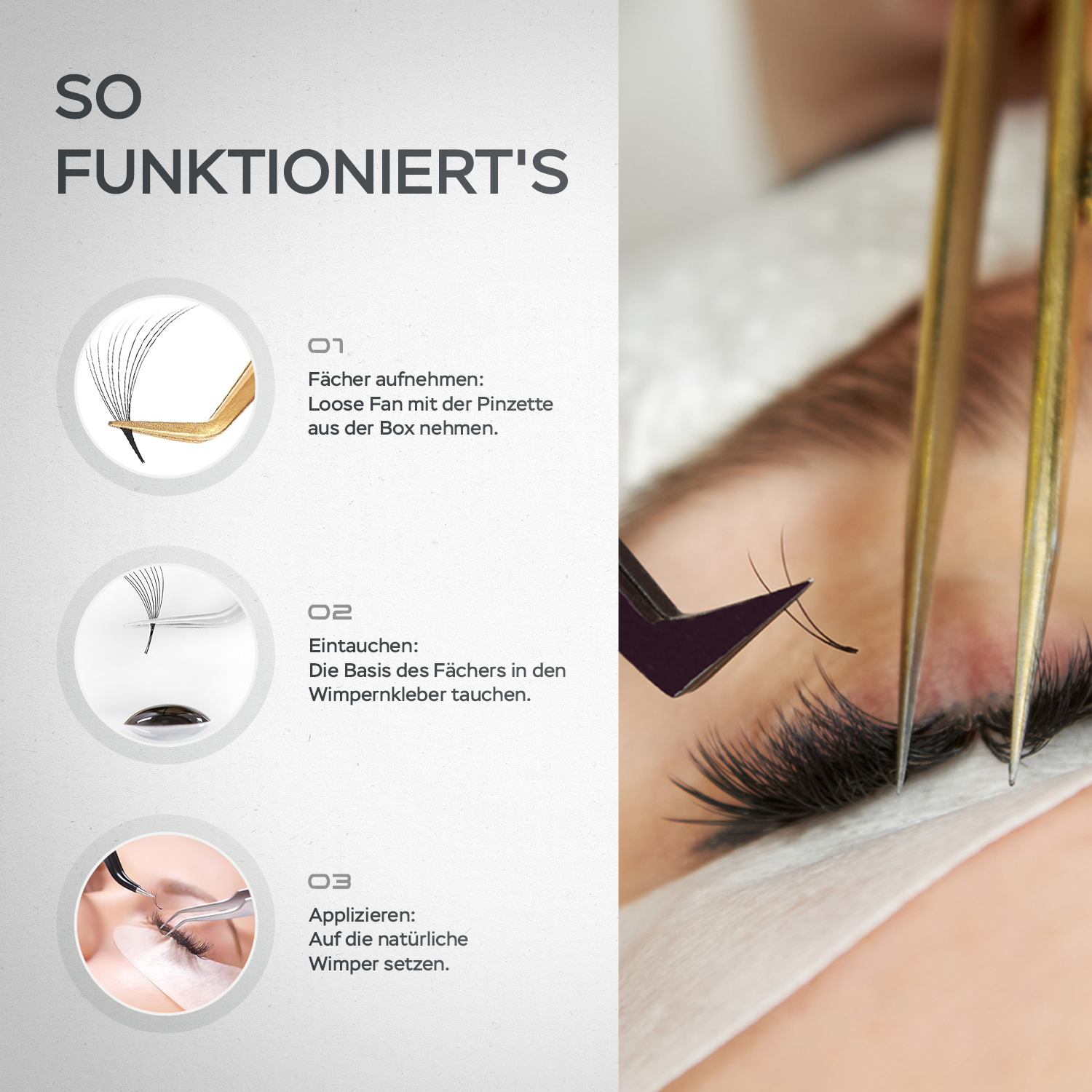 Unsere Fans bestehen aus der neuesten deutschen PBT-Faser, verstärkt durch Nano-Technologie, die eine mühelose Applikation, bessere Haftung und ein natürliches, angenehmes Tragegefühl ermöglicht. Dank der ultrafeinen Struktur haften die Extensions sofort und präzise, ohne an Komfort zu verlieren. Das Ergebnis: Wimpern, die sowohl im Alltag als auch optisch überzeugen.